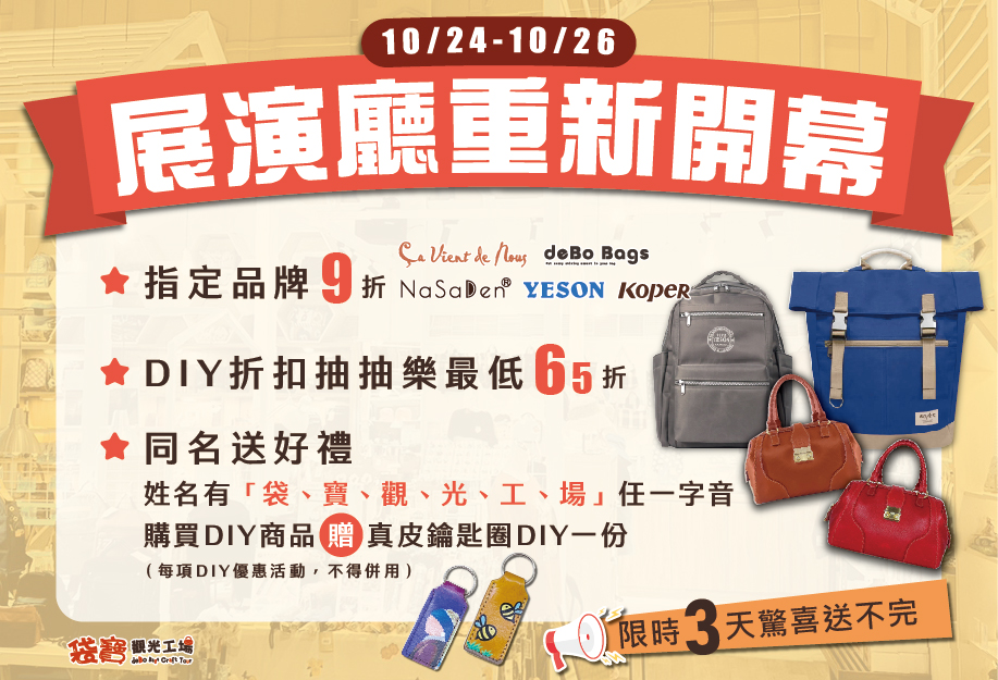 叮咚~袋寶展演廳重新開幕啦 新空間、新氣象,還有滿滿限定活動等著你~ 10/24-26三天限定的狂歡祭典,玩手作、買好包、抽折扣,一次滿足
