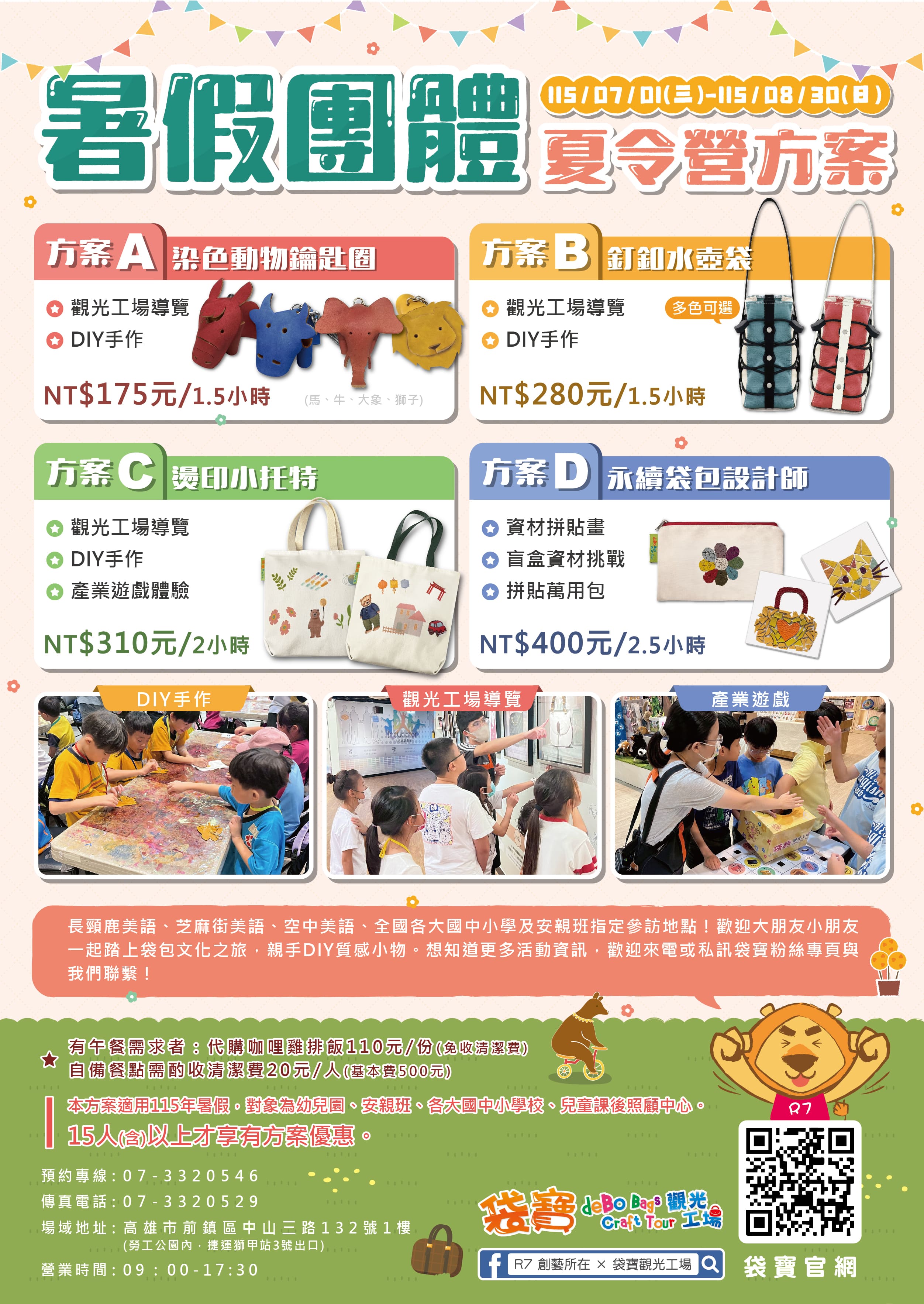 | 還在規劃暑假活動嗎?來點不一樣的體驗吧! 從導覽認識袋包小知識,到DIY手作體驗, 邊玩邊學,讓孩子在暑假留下最有趣的回憶 【方案介紹】 A:染色動物鑰匙圈+導覽 $175元/1.5小時 B:釘釦水壺袋+導覽 $280元/1.5小時 C:燙印小托特+導覽+產業遊戲體驗 $310元/2小時 D:永續袋包設計師 $400元/2.5小時 ■ 活動期間:115/07/01(三)–115/08/30(日) ■ 適用對象:幼兒園、安親班、兒童課後照顧服務中心等15人以上的團體 快帶小朋友一起來玩創意、做作品,過一個超有趣的暑假吧 暑假名額有限,團體歡迎提早預約! ![]() |